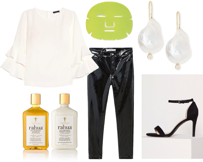 Lana Ruffled Crepe top from J.CREW – Green Tea Water Bomb Mask from 100% PURE – 'Sea of Beauty' Keshi Pearl Drop Earrings from MIZUKI – Voluminous Shampoo and Conditioner Gift Set from RAHUA – Vinyl Trousers from MANGO – Heel Sandal from NELLY.